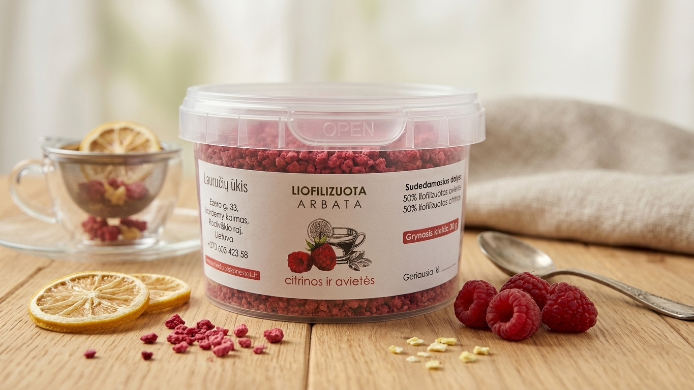 Liofilizuota arbata citrina ir avietės – tai 100 % natūralus ingredientų mišinys, pagamintas naudojant liofilizavimo (šaltyje džiovinimo) technologiją. Šio proceso metu išsaugoma didžioji dalis vertingų maistinių medžiagų. Arbata be pridėtinio cukraus, konservantų ar dirbtinių priedų.