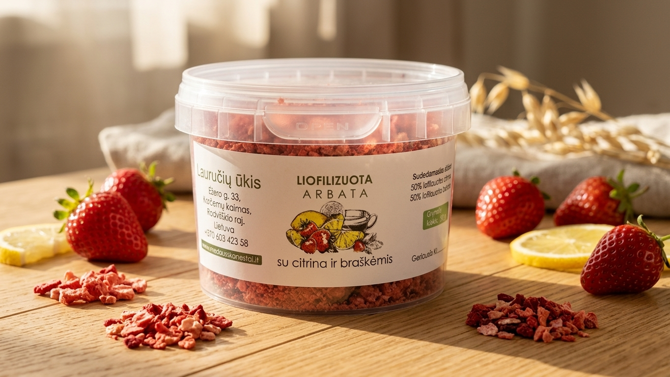 - 50 % liofilizuotos citrinos, 50 % liofilizuotos braškės.