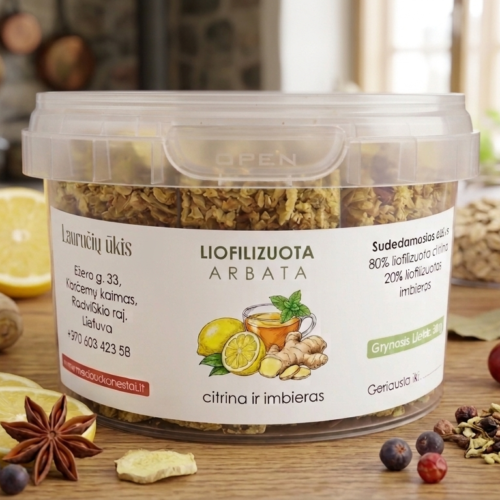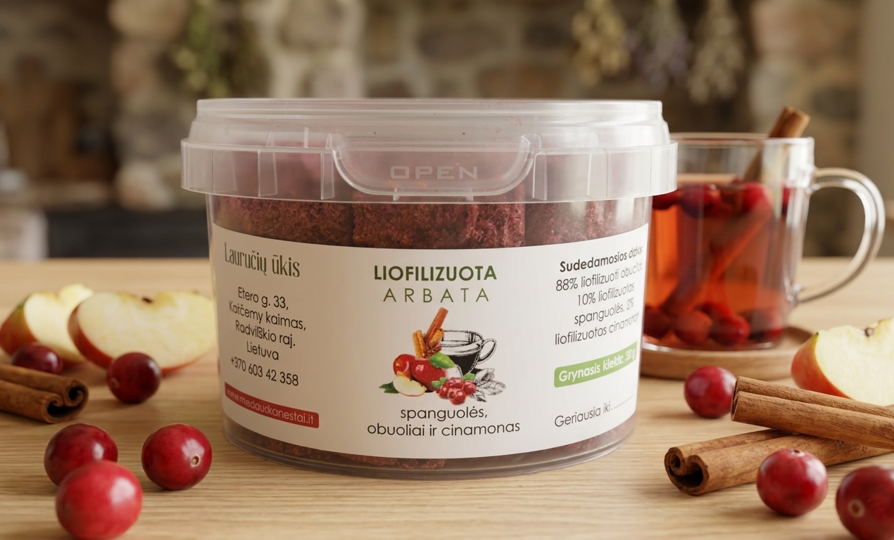 Liofilizuota arbata su spanguolėmis, obuoliais ir cinamonu šildantis, gaivus ir natūralus gėrimas imunitetui